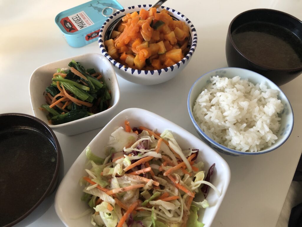 サラダと、野菜のお浸し、おれんじ色は野菜のトマト煮