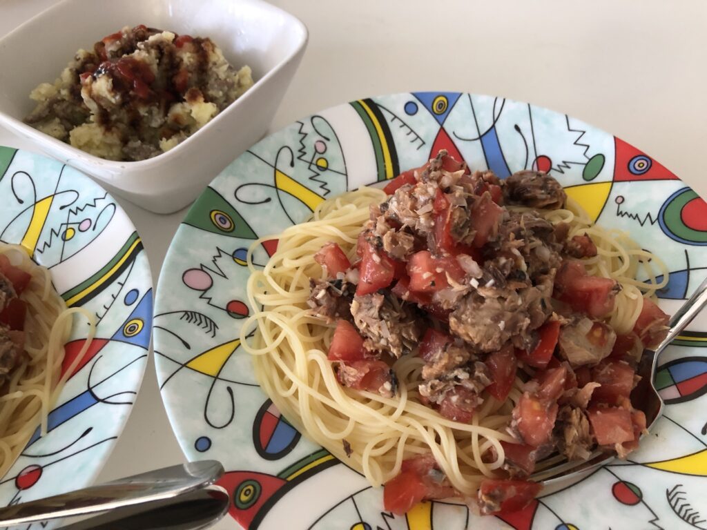 カペリーニという細いパスタ(なんと茹で時間3分)にサバ缶にんにく玉ねぎトマトを和えた