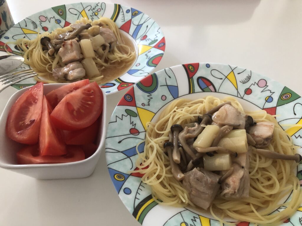 ホワイトアスパラと鶏肉しめじのスープパスタ