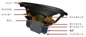 スピーカーは音の振動を伝えるダイヤフラムとそれを駆動するボイスコイルと磁石から構成されています
