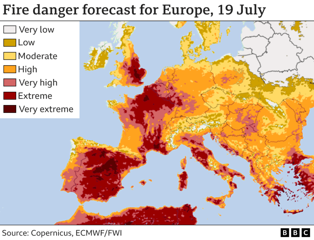 ヨーロッパは熱波到来する時に危険度マップが毎年発表されます。日本で言う台風注意報の様なものでしょうか