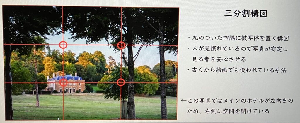 オート機能で写真を撮影するとそれっぽい映像が撮れますけど、そこから脱却するためにマニュアル操作のイロハを教えて貰うと共に、写真の基本的な構図について勉強しました