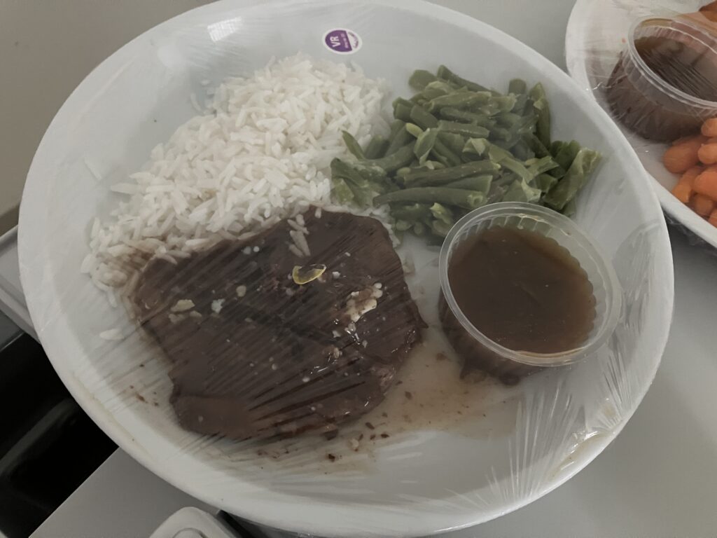 夕食2:牛肉を煮込んだもの、インゲン豆、ご飯