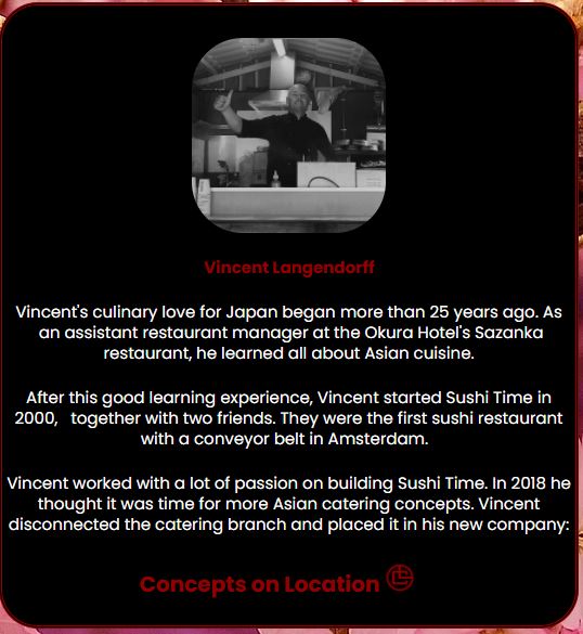Vicent Langendorffはホテルオークラを退社した後に、アムステルダムWTC(ワールドトレードセンター)でSushi Time一号店を出店します。