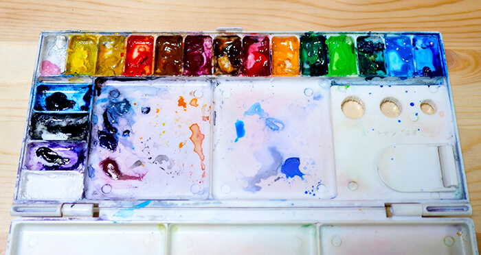 パレットの上に色んな絵の具を乗せて
