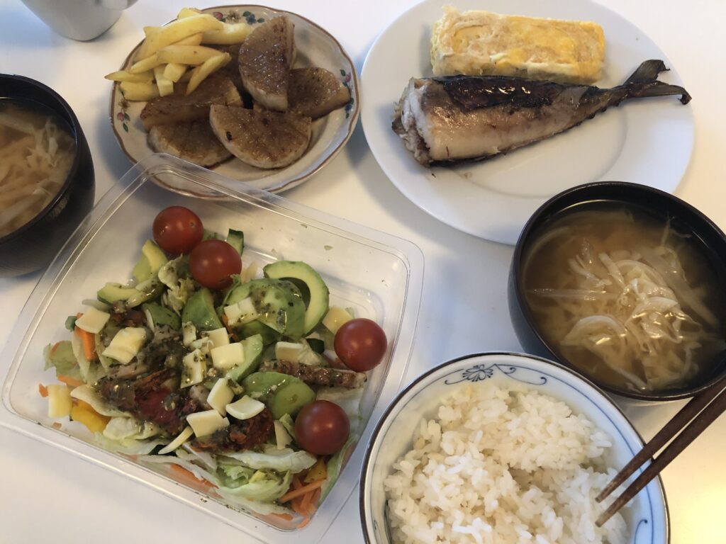 サバの燻製を焼いたのと大根ステーキ、サラダとポテトセット