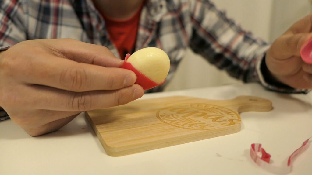 赤色の部分はワックスで、中の乳白色のチーズ部分を食べます