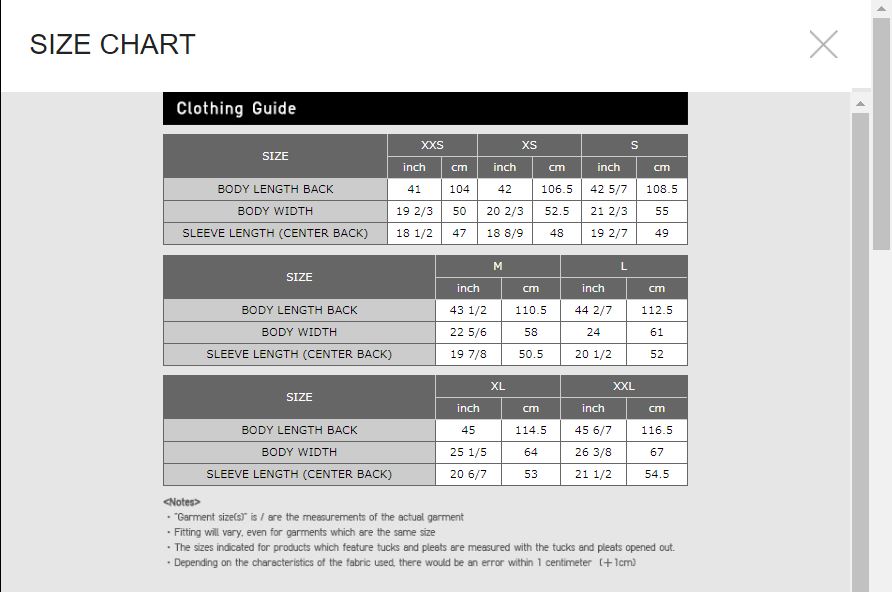 ユニクロのオンラインページは詳しいサイズ表も書いてるから