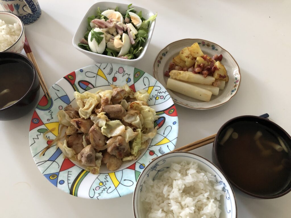 旬のホワイトアスパラを茹でて炒めたベーコンとポテトと一緒に