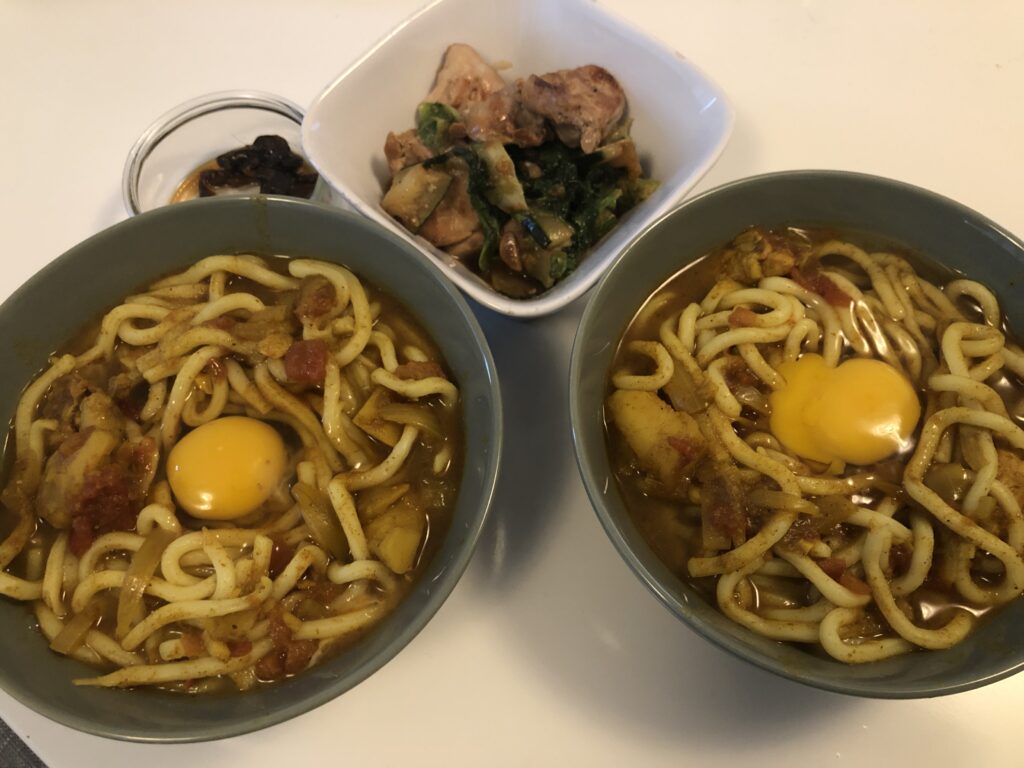 カレーうどんに生卵をトッピング (Minaも食べるんかーい)