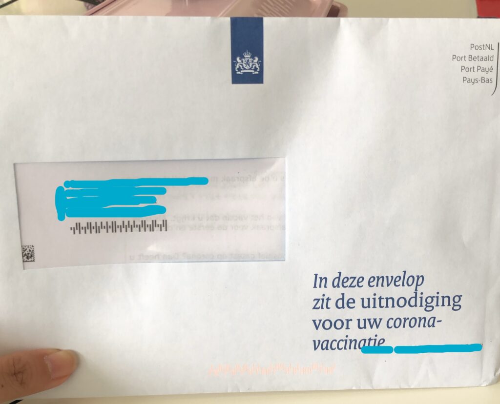 この中に、ワクチン接種を予約するQRコード、健康に関するアンケート、コロナワクチンのインフォメーションが入っています。全てオランダ語です