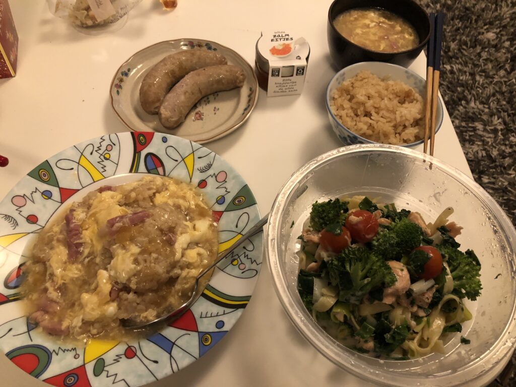イクラと炊き込みご飯とソーセージにあんかけ天津飯やらパスタ付きサラダ