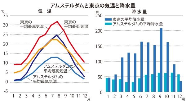 なんと! アムステルダムの夏の平均最高気温が、東京の平均最低気温より低いみたいです