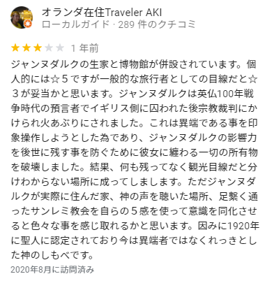 例えば平均評価4.2のジャンヌダルクの生家(Birthplace of Joan of Arc)は良い場所なんですけど評価3にしました