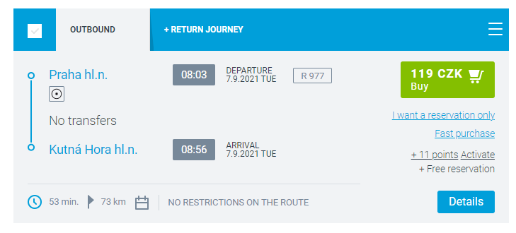 こんな感じでPraha hl.n.(PRAHA HAVNI NADRAZI駅の事です)からクトナーホラまで購入できます