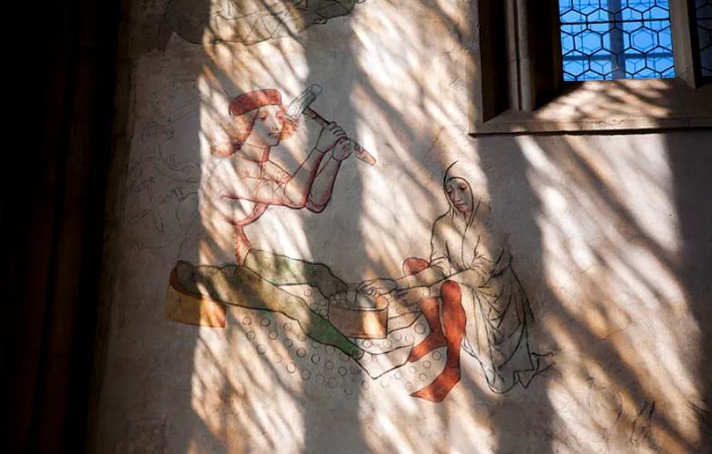 漆喰で別の絵が上塗りされていたのですが、それが建設中に剝がれ落ちて発見されたので下に隠れてた当時の壁画が当時の状態を保ったままだったのだとか。