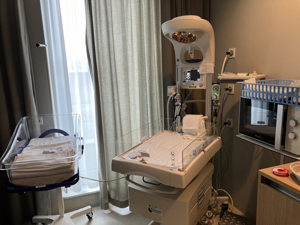 一番左の透明な容器が赤ちゃん用のベッド。生まれてからはここに寝かせて一緒に過ごします